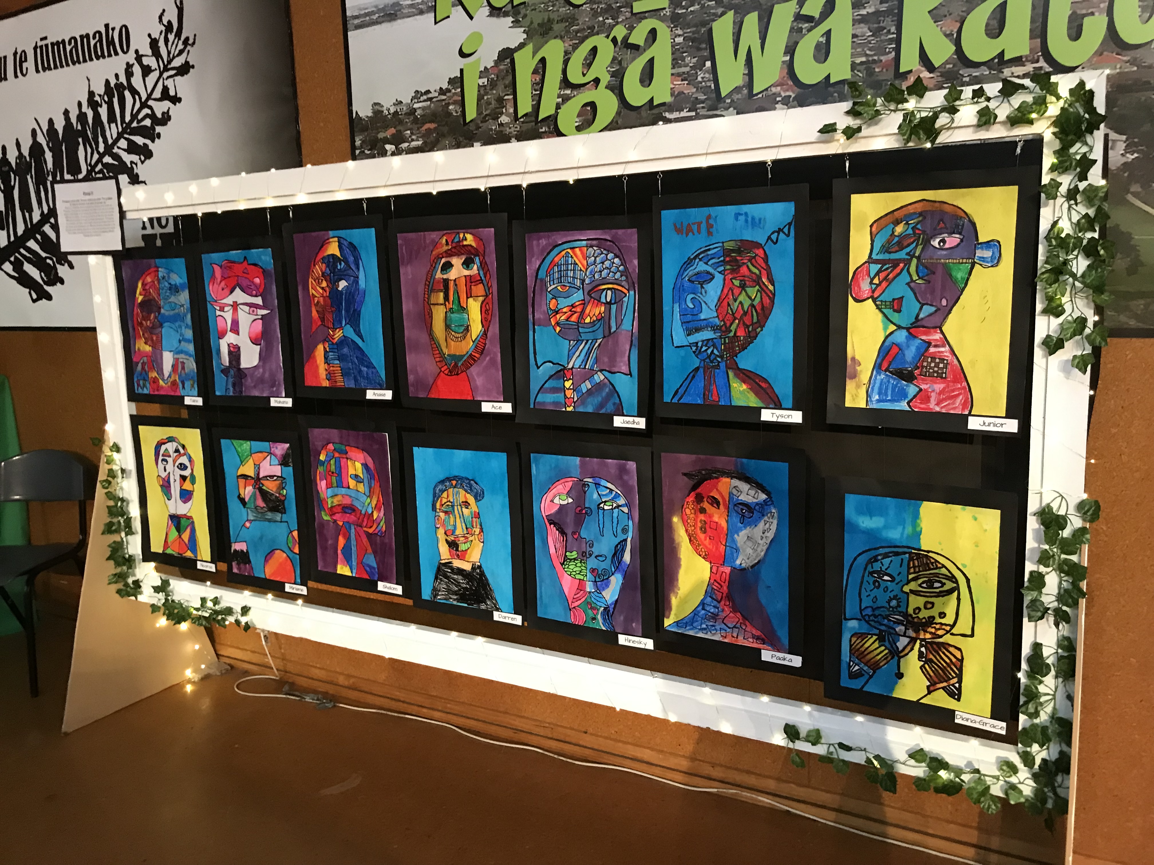 Rm 24 really enjoyed looking at all the amazing artwork displayed in the hall as part of our Inquiry for this term. We recognised some different styles of art such as photography, digital prints, clay, masks, self portraits. Plus we had our very own plasiticine bead necklaces displayed on the light board! Well done for all your hard mahi everyone!